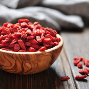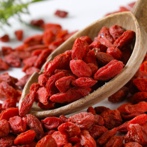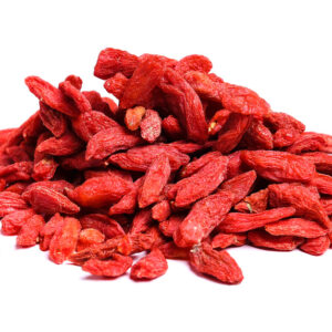 The goji berry, also called the wolfberry, is a bright orange-red berry that comes from a shrub native to China. Goji berries are eaten raw, cooked, or dried (like raisins) and are used in herbal teas, juices, wines, and medicines.